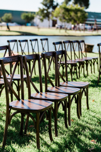 Our Blissville Package includes a Golden circular arbour, 24 Brown Bentwood cross-back chairs, distressed vintage signing table and 2 Rosewood signing chairs with matching aisle decorations.