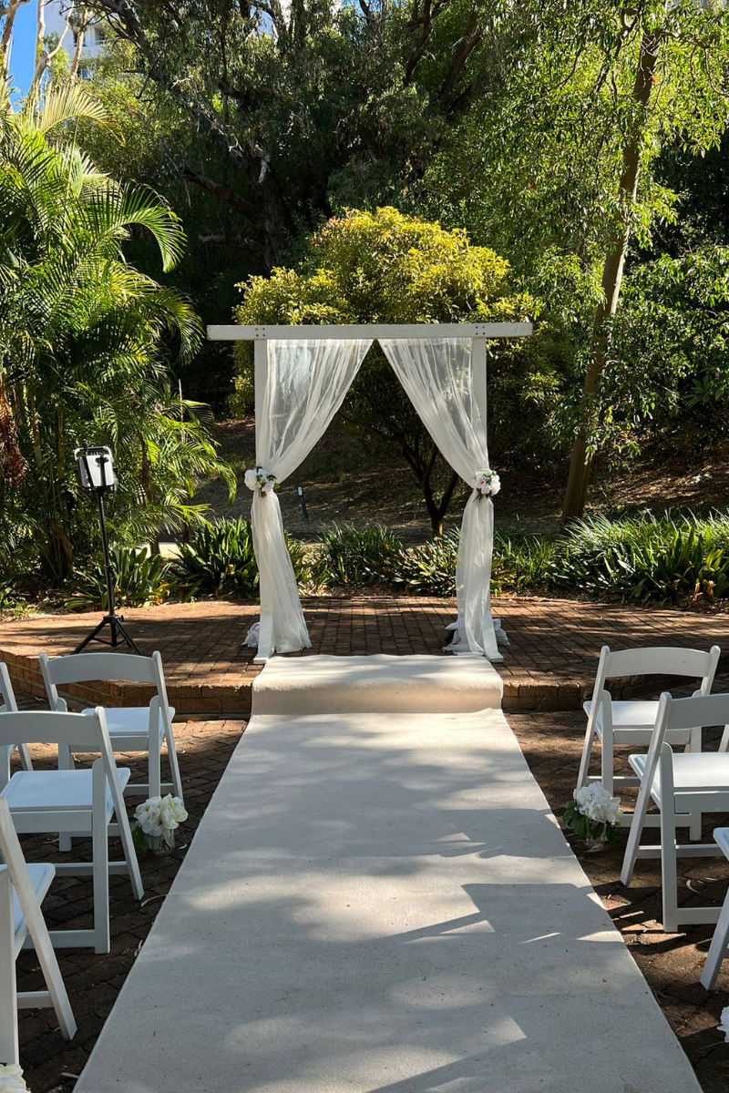 The Central Park Package contains; 24 metal black Bentwood chairs, A gorgeous gold metal mesh Arbour with Florals, 2 black Bentwood metal signing chairs, a black French provinical table for signing and a beautiful handmade silk Floral Arrangement with natives, burgundy and red peonies and orchids. Plus Our Giant LOVE Letters can be added to any Ceremony Package.