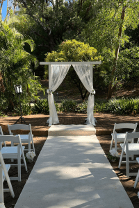 The New York Traditional Package included 24 Bella Evolution ceremony chairs, a Gorgeous White Wooden Arbour with White Sheer Curtains, White Aisle Carpet, 2 Tiffany signing chairs and classic Writing Desk signing table.