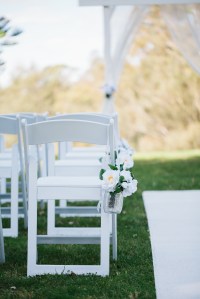 The Soho Vintage Wedding Package includes 24 Bella Ceremony Chairs, Wooden Arbour with White Lace Curtains, 7 meter White Aisle Carpet, 2 Tiffany Signing Chairs, a Classic French Writing Desk for your signing table, Aisle Decorations – Babies Breath & Peonies in mason jars.